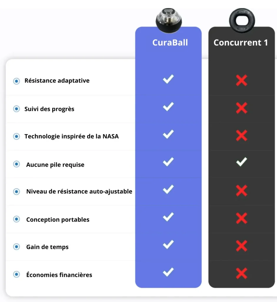 Le noyau gyroscopique de CuraBall, inspiré par la NASA, vous aide à transformer vos mains faibles, raides ou douloureuses en mains puissantes et sûres, sans douleur, sans médicaments ni thérapie.